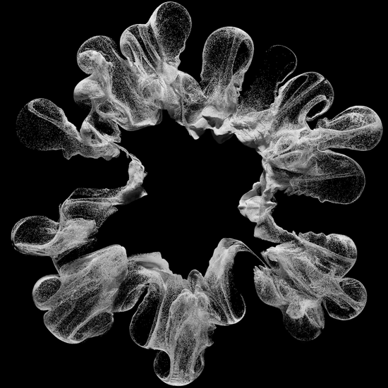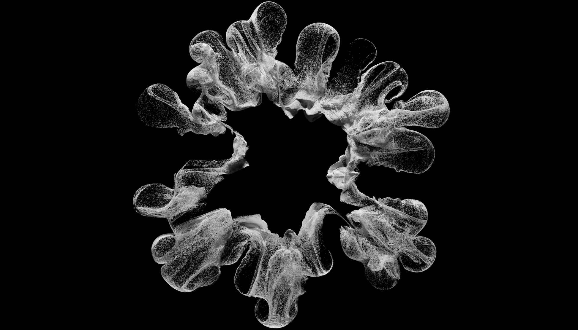 3d render of abstract art video of surreal black and white monochrome smoke explosion based on white small balls spheres particles on black background