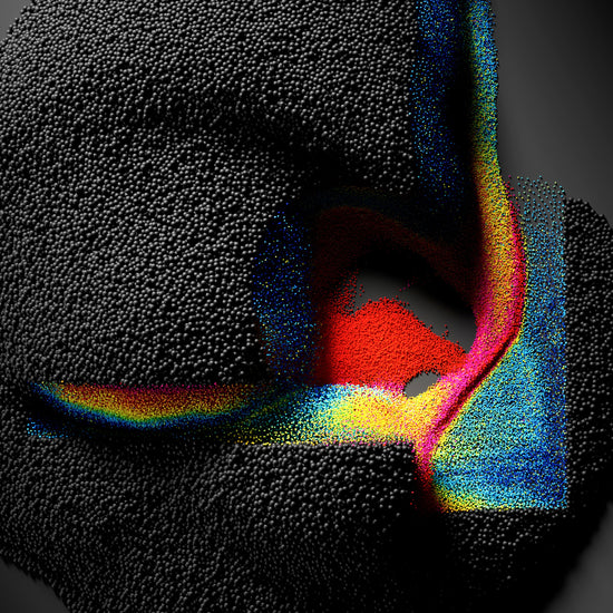 3d render of abstract art video animation with small balls spheres particles in the motion process in dark grey color with colorful yellow blue parts on grey background surface