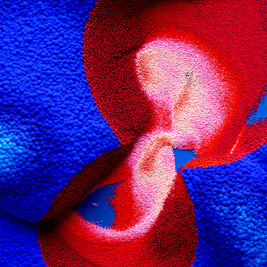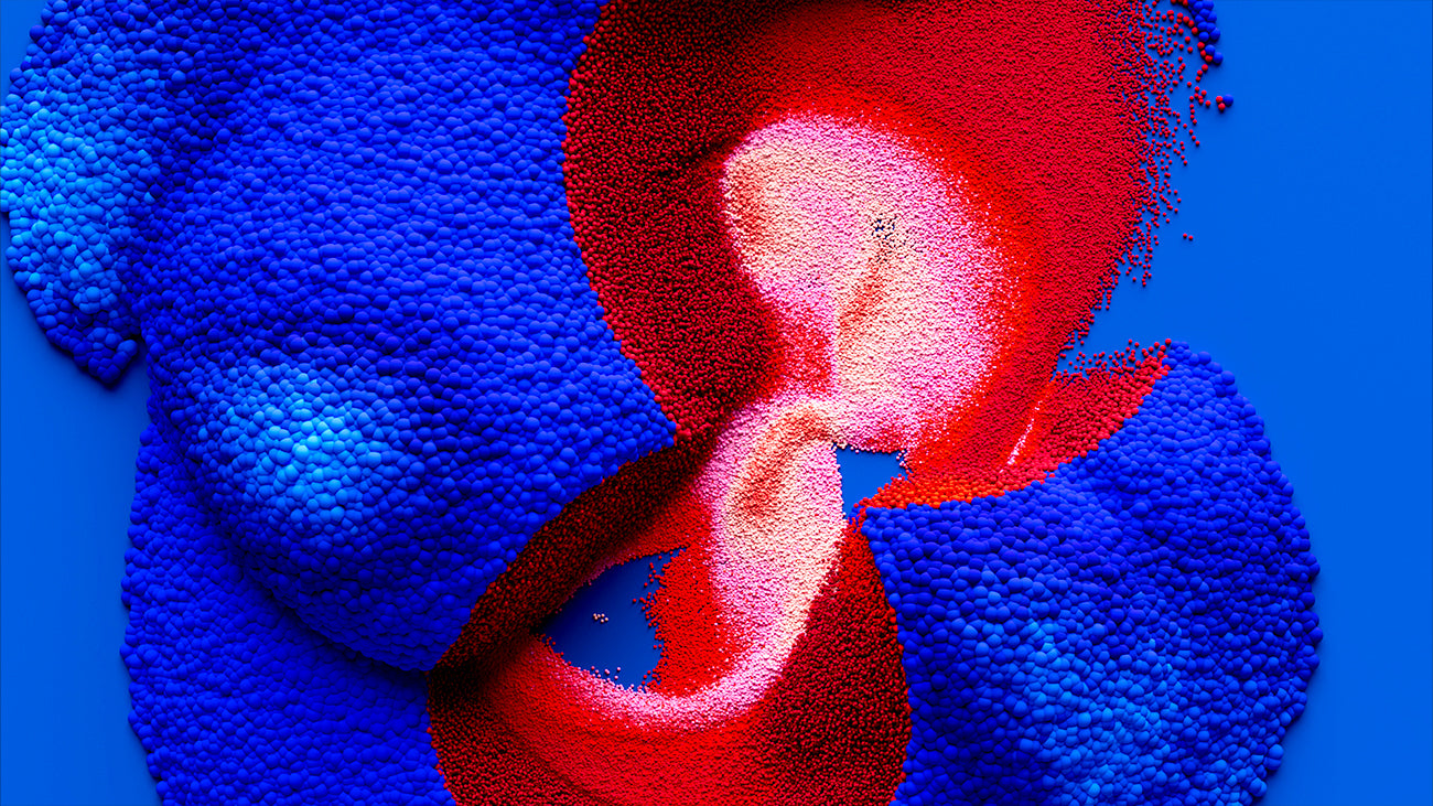 3d render of abstract art video of surreal blue particles with red circles on blue background, hi-res 4k video